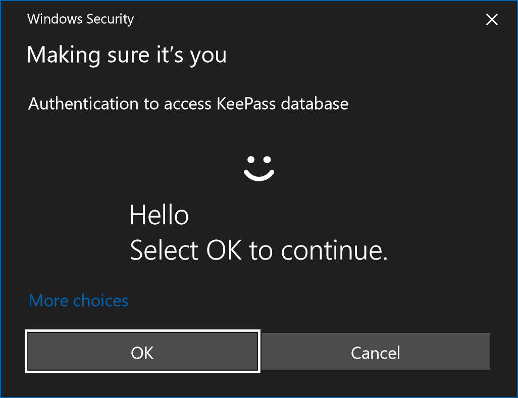 choco install keepass-plugin-winhelloBy default this plugin holds an encrypted master password in memory and removes it upon KeePass closing. In order to be able to unlock your database via Windows Hello authentication in between KeePass launches you may check "Store keys in the Windows Credential Manager" on in the Options dialog. This will prompts you for creating a persistent key signed with your biometry via Windows Hello. The key is used to encrypt master passwords for securely storing them in the Windows Credential Manager.