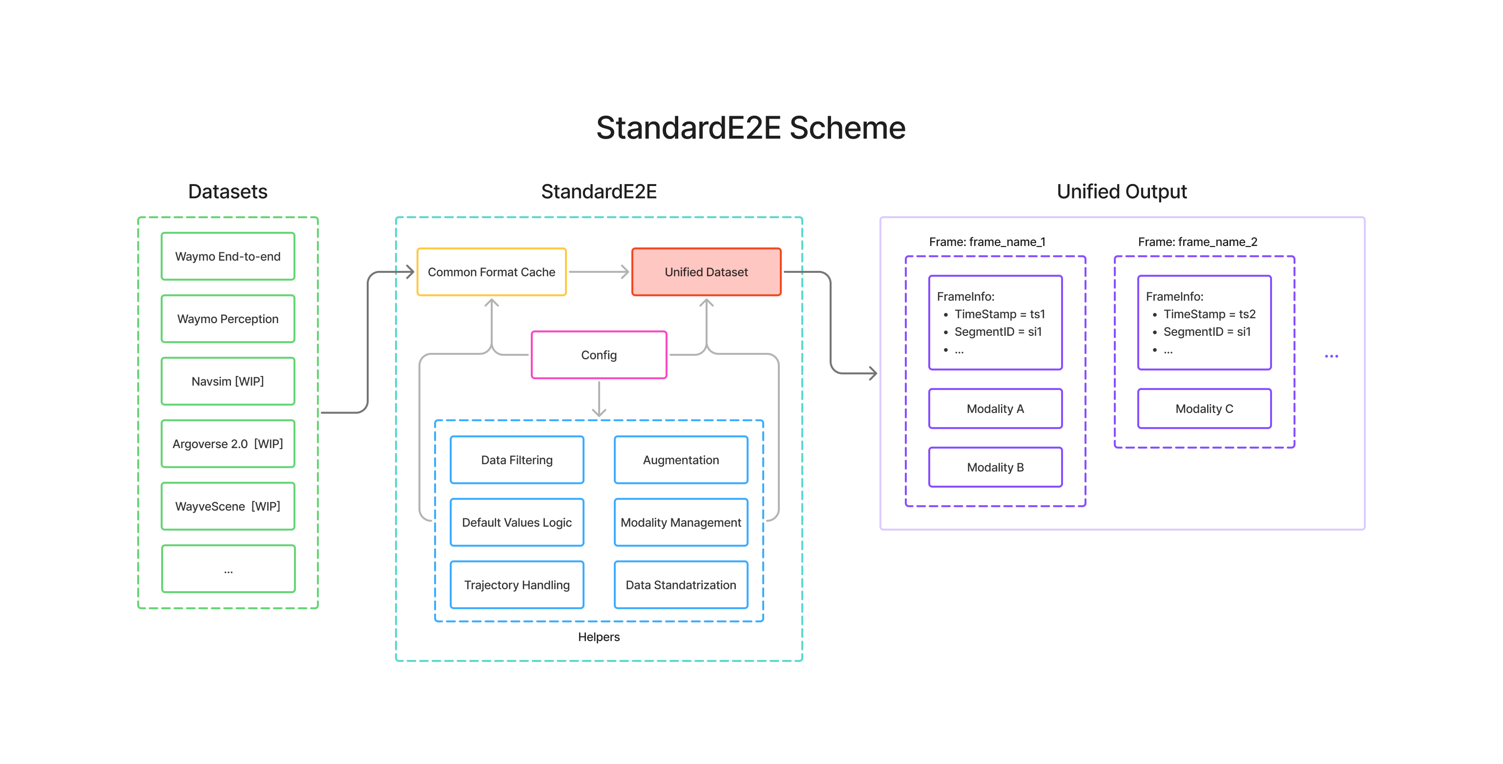 StandardE2E provides a consistent interface for preprocessing, loading, and training with multimodal data from various end-to-end autonomous driving datasets. It standardizes the complex process of working with different dataset formats, allowing researchers to focus on model development rather than data engineering.