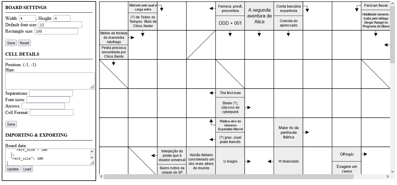 - Load: replaces the current crossword with the one represented in the text area's JSON code (this will remove current changes!)