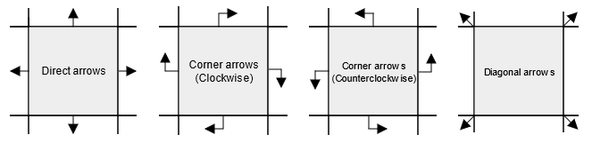 | Direct arrows | Corner arrows (clockwise) | Corner arrows (counterclockwise) | Diagonal arrows | ||||