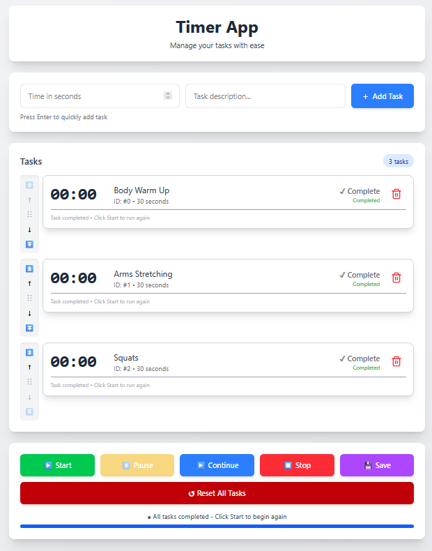 - Multiple Task Management: Add, delete, and reorder multiple timed tasks
