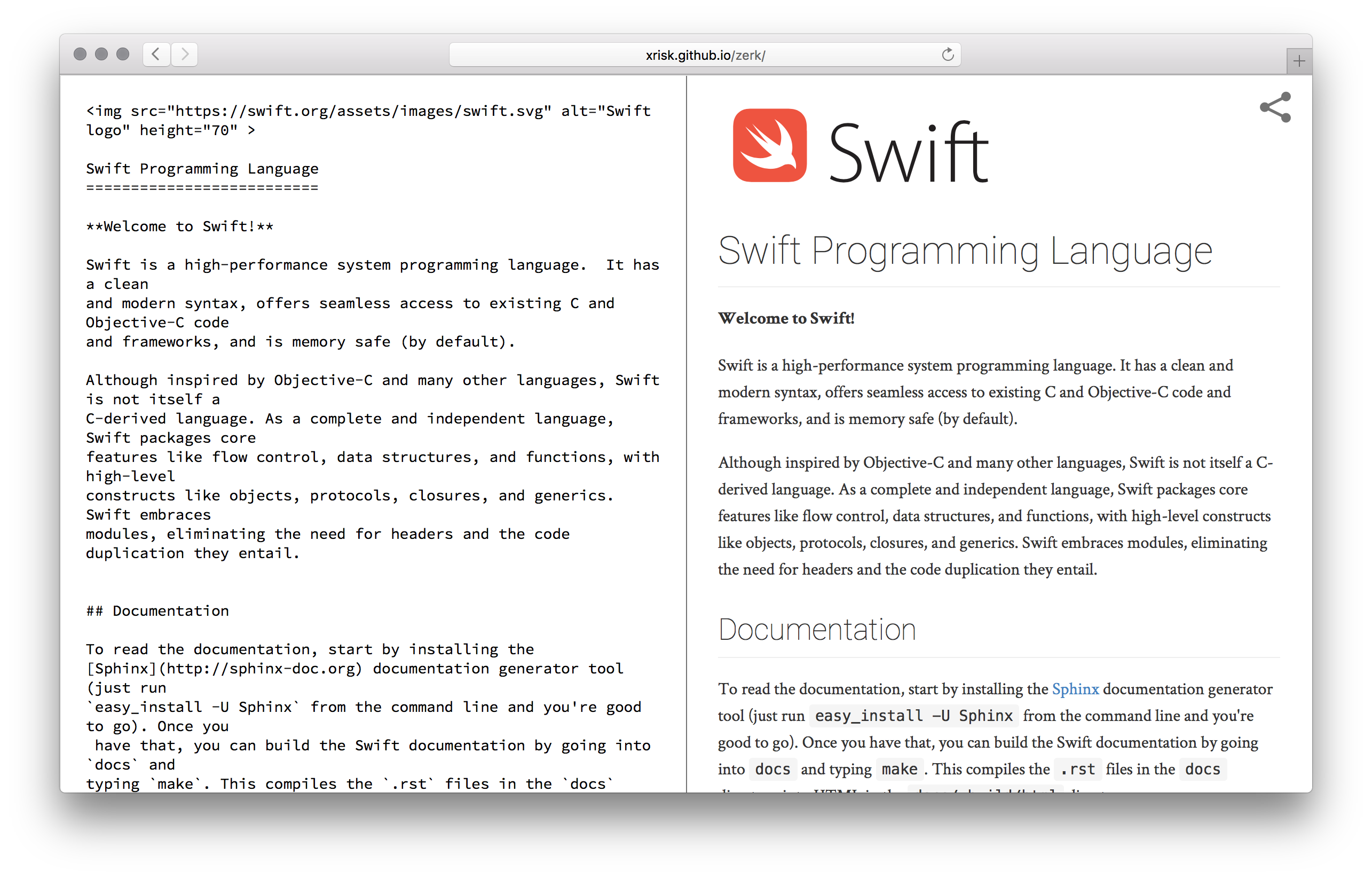 zerk A minimalist markdown REPL, nothing more. Write ye markdown, see ye browser render it live. Fully live and in-browser with zero server-side processing. Crafted by xrisk & onlineth.